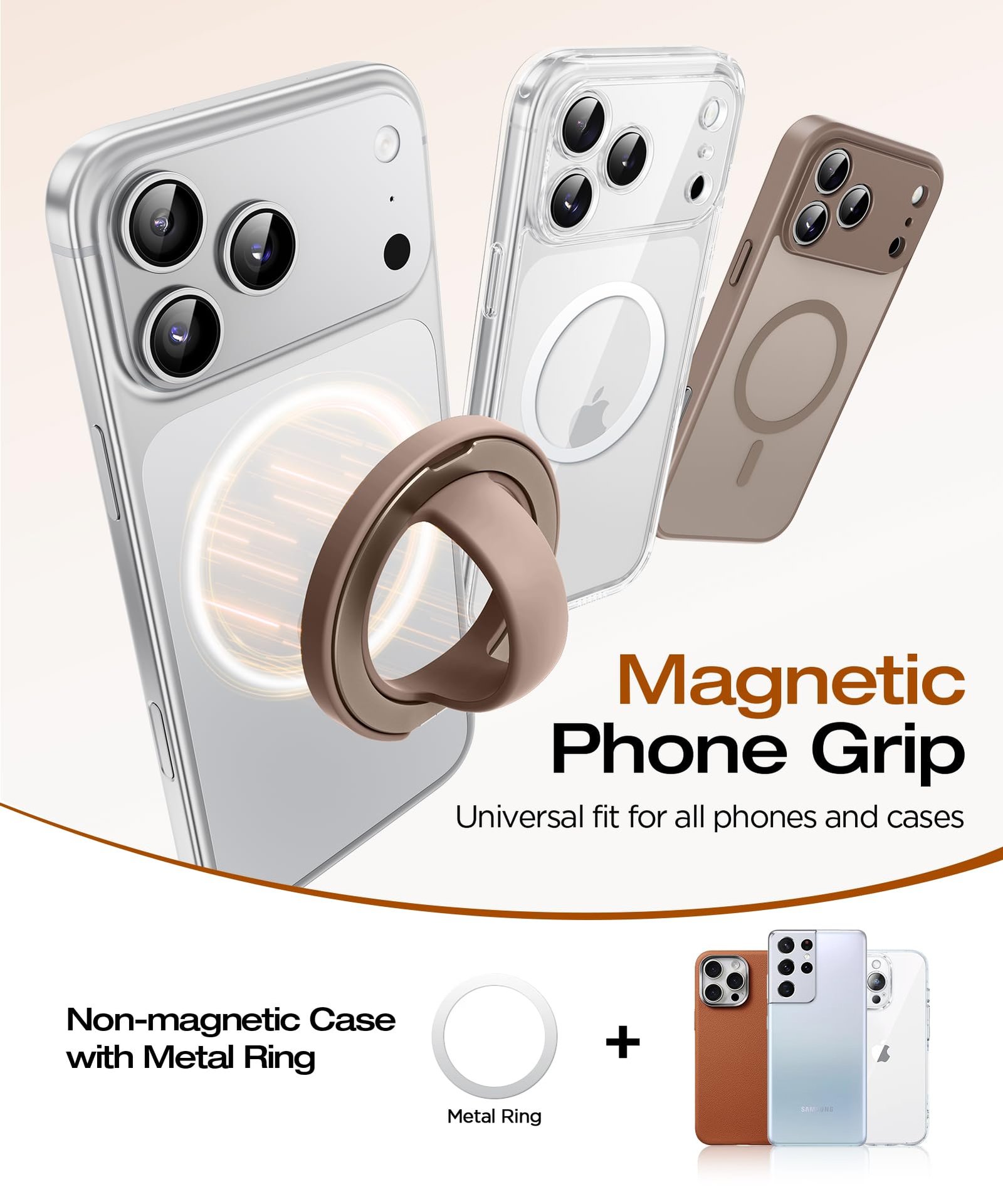 SuydanBox Magnetic Phone Grip, 360° Rotation & 180° Flip Universal Phone Ring Stand, Silicone Phone Ring Holder for Back of Phone for iPhone 17/16/15/14/13/12 Pro Max/Plus, Brown